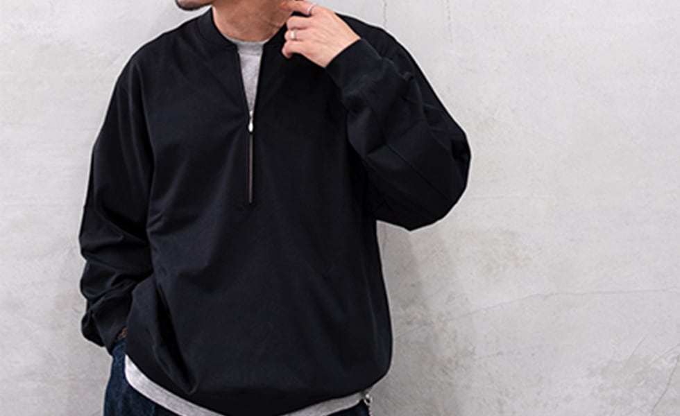 スウェットよりもライトな素材感がポイントのハーフジッププルオーバー。